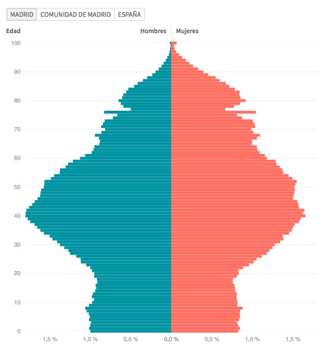 Para esta visualización realizamos una única llamada a Populate Data, donde obtenemos la población para cada año y edad y convertiremos el valor en porcentaje, habiendo calculado previamente el total de hombres y mujeres para cada edad.
