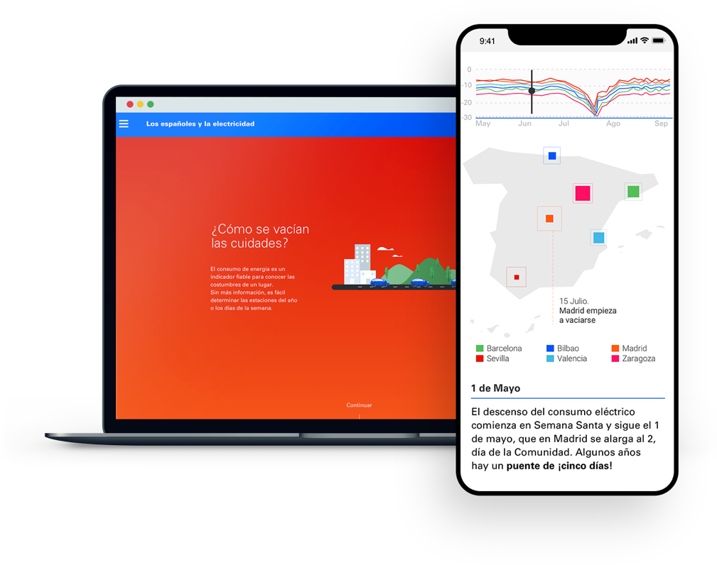 De una base de datos con cientos de millones de registros de clientes repartidos por toda España a visualizaciones que te permiten entender los datos de un vistazo y una historia para guiarte en su exploración, contextualizando con fuentes de datos externas para explicar otras facetas de los datos.
