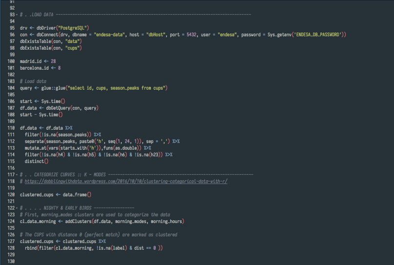 Estas curvas han sido procesadas mediante técnicas de análisis de series temporales, lo que ha permitido eliminar el ruido y determinar la curva modelo de cada hogar. Sobre estas curvas ha realizado un proceso iterativo de entrenamiento y análisis de clusters hasta determinar unos conjuntos de hogares representativos, utilizando una función de entrenamiento que minimizaba la distancia de las curvas a todos los clusters.