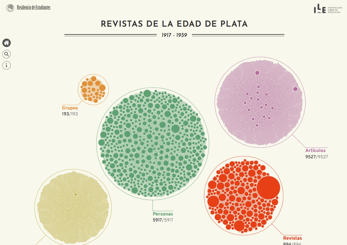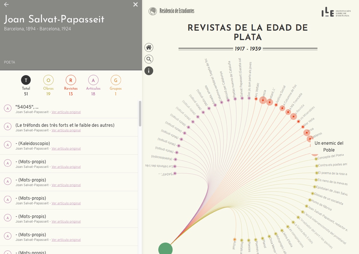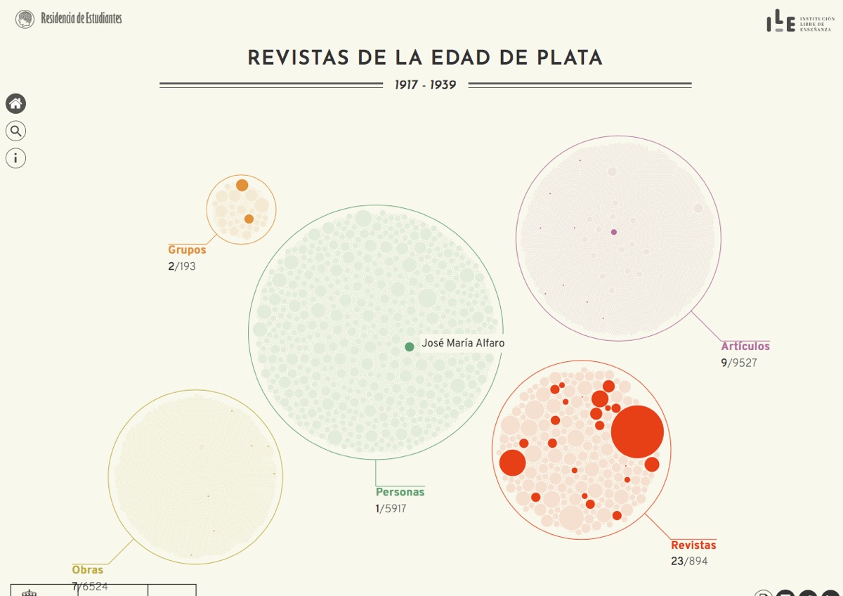 This legendary Spanish cultural institution (the residence of Dalí, Lorca and many others in their formative years) treasures tons of all kinds of material. They had extracted entities (themes, people, movements, places, works...) in a corpus of magazines over 30 years, and they wanted an interface to understand connections and enable exploration. We helped them to envision the exploration experience, process data, and build the interactive application. In collaboration with visualizados.com.